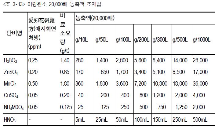 (4) 미량원소는 20,000배의 농축액을 별도로 만들어두고, 100배 또는 200배액을 만들 때 사용한다.
