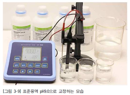 (가) pH미터의 전원을 켜고 센서를 표준용액 pH 9.0에 넣고 값이 안정화될 때까지 기다린다.