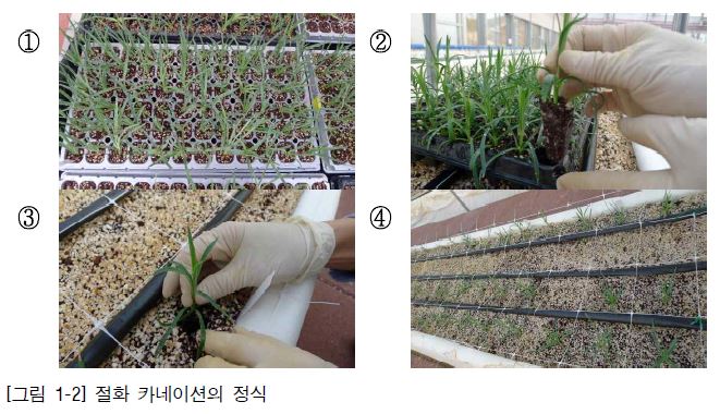 1. 4치 절화 국화 묘의 정식을 위해서 하우스 내 포장을 조성하고 절화망 및 점적호스등을 설치해 둔다.
