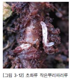 유백색의 가늘고 긴 유충이 삽목한 묘의 땅과 맞닿는 부위를 가해하여 발근을 억제되며, 파리류중 작은뿌리파리 유충은 겨울철 시설재배에서 거의 모든 작물에 발생해 피해를 주고 있는 해충이다. 특히 분화류와 관엽식물의 삽목상에서 유충(어린벌레)이 작물의 뿌리를 스펀지 형태가 되도록 해 시들게 한다.