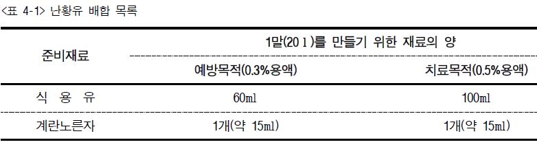 1. 난황유 제조 방법 및 농도는 살포하고자 하는 대상과 목적에 따라 양을 조절할 수 있다. 가정에서 소량으로 만들어야 되는 경우에는 양을 최소량으로 줄여서 조정한다.