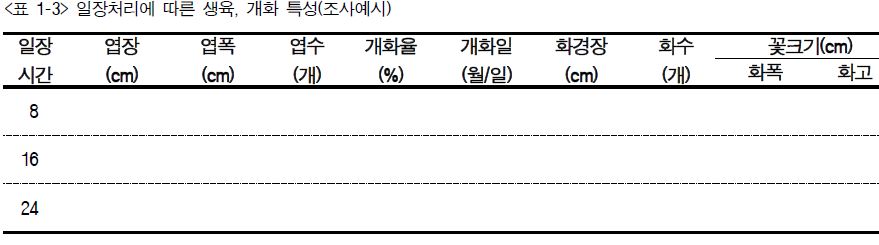 8. 꽃눈이 보이기 시작하면 매일 상태를 기록하도록 한다. 처리완료 후 개화특성 등을 조사 작성할 수 있다. 일장처리에 따른 생리장해가 있는지 조사한다.