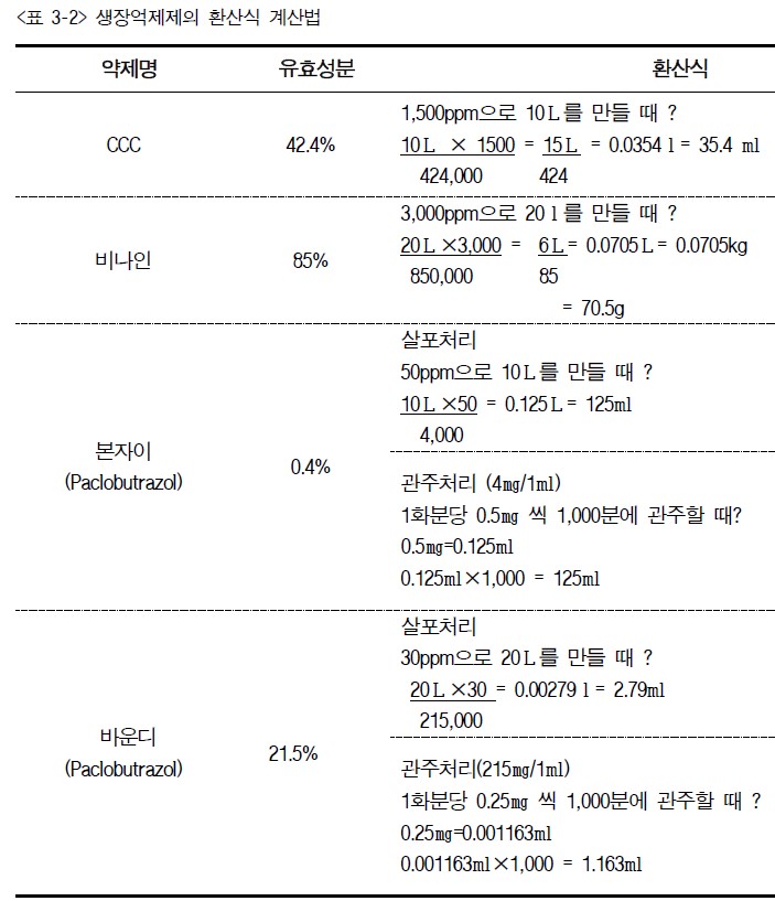 생장조절제는 유효성분에 따라 환산식이 달라진다. 아래의 환산식을 이용하면 모든 약품의 필요 소요량을 계산할 수 있다.