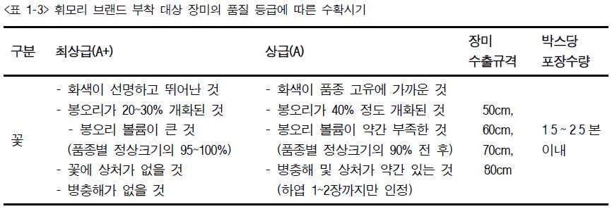 수출용 장미의 품질등급에 따라 수확 시기는 표 1-3과 같다.