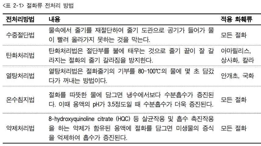 으나 없는 것도 있다. 열탕처리법은 절화 줄기의 기부를 80~100℃의 물에 수초동안 담근 후 찬물에 옮기는 방법이다. 물에 꽂을 때에는 처리된 부분을 모두 재절단하여 물속에서 부패가 되지 않도록 한다. 이때에 식물체내의 수분이 증기가 되어 팽창하기 때문에 그 장력으로 수분을 끌어 올리게 된다. 안개초 및 국화에서는 열탕처리가 수분흡수 증진과 수명연장에 효과가 있으나 품종에 따라서는 오히려 노화가 촉진되는 경우도 있다. 전처리 방법 중 약제처리법은 수송이나 저장전에 단시간 줄기 기부에 처리하는 것으로, 펄싱(pulsing)이라고도 한다.
