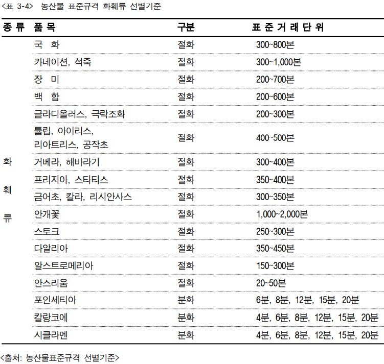 1. 농산물 표준규격의 화훼류 크기를 구분한다. 농산물 표준규격의 화훼류 크기 구분은 표 3-3과 같으며, 선별기준은 표 3-4와 같다.