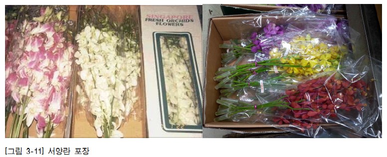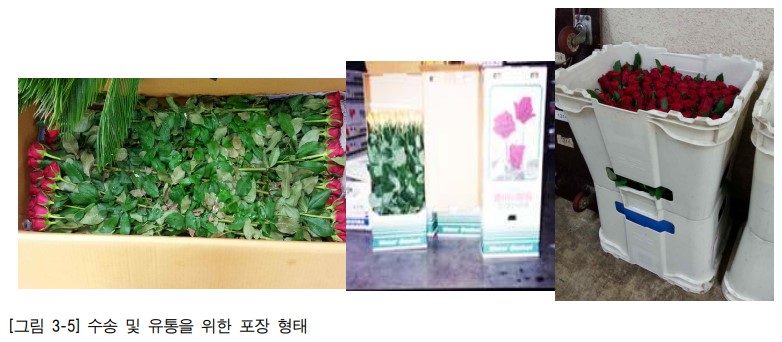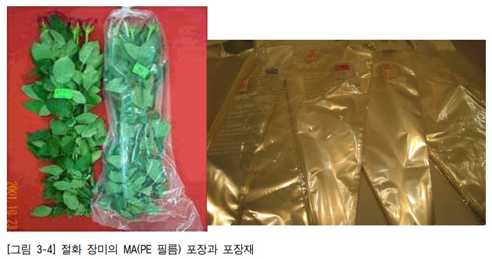 포장은 유통 중 물리적 손상 및 수분손실 및 다양한 외부환경 등으로부터 절화의 보호를 목적으로 한다, 또한 포장을 통해 상품성을 향상시킬 수 있어야 하며, 선도유지 및 고품질화에 효과적이어야 한다. 포장에는 MA 포장, 건식포장, 습식포장이 있다(표 3-7).