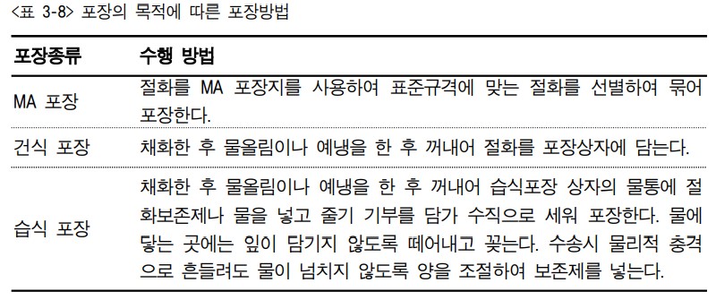 1. 포장의 목적에 따라 포장방법을 달리한다. 화훼류 포장은 목적에 따라 포장 방법이 달라진다(표 3-8).