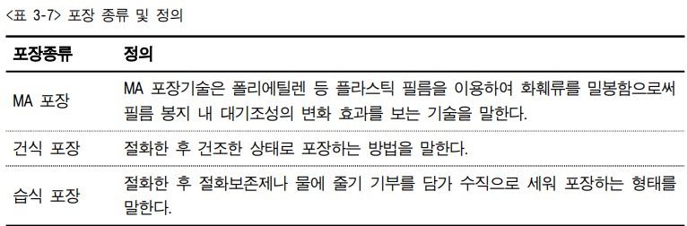 포장의 목적에 따라 MA 포장, 건식포장, 습식포장이 있다(그림 3-4, 3-5). 우리나라 농가는 대부분 수작업으로 포장을 하나, 외국에서는 수작업에서 자동포장으로 전환되고 있다(그림 3-6).