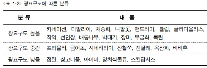 1. 광환경에 따른 정원식물을 선택한다. 광에 대한 요구도에 따라 극음수, 음수, 중성수, 양수, 극양수 등으로 분류가 가능