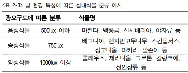 열대, 아열대 원산의 관엽식물들은 실내의 저광도 조건하에서도 잘 자랄 수 있지만 경우에 따라서는 광 요구도가 높은 식물도 있다. 광 요구도에 따라 실내식물을 양생식물, 중생식물, 음생식물로 분류할 수 있으며, 콜레우스, 제라니움, 크로톤, 칼랑코에, 선인장류는 광요구도가 높은 양생식물에 속하며, 750lux 이상의 광을 요구하는 중생식물에는 베고니아, 벤자민고무나무, 스킨답서스, 싱고니움, 파키라, 팔손이, 페페로미아, 필로덴드론, 드라세나, 관음죽 등이 속한다. 500lux 정도에서도 자랄 수 있는 음생식물에는 마란타, 백량금, 산세베리아, 스파티필름, 안스리움, 야자류 등이 있다. 온도에 따라 식물의 광합성, 수분 흡수 및 이동, 식물체내 대사활동이 영향을 받게 되며, 온도조건이 적합하지 않으면 생육이 불량해진다. 식물의 원산지에 따라 분류하는 것이 좋으며, 실내 환경은 모든 식물의 생육에 적합한 온도 범위 내에 있으므로 따로 온도를 조절해 줄 필요는 없으나, 겨울철에는 베란다에 있는 관엽식물을 안으로 들여놓아야 한다. 뿌리에서 수분과 양분 흡수가 잘 이루어지도록 토양 수분 유지가 필요하다. 과습은 뿌리 호흡을 불가능하게 하여 생육을 방해하고, 건조는 식물의 위조를 촉진하게 된다. 실내에서 기르는 식물은 겨울철 실내 난방에 의해 공기가 건조하기 쉬워 뿌리 흡수량보다 잎을 통한 증산량이 많아 잎이 건조하게 되기 쉬우므로 실내 습도 조절이 필요하다. 관엽식물의 습도 요구량은 종류에 따라 다른데, 선인장류, 산세베리아, 아쟈류 등은 50% 미만의 저습도를 요구하며, 피토니아, 필레아, 천남성과 식물 등은 70%이상의 고습도를 요구한다.