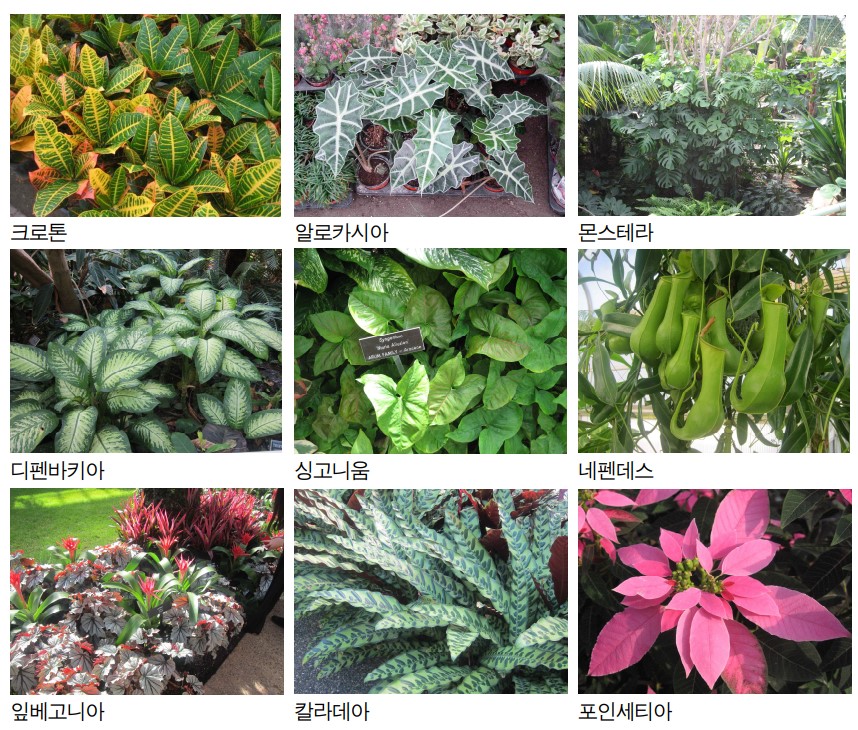 (1) 관엽식물이란 실내에서 잎을 주로 관상하는 식물을 말한다. 잎이나 줄기의 형태, 색상, 무늬 또는 식물체 전체 외형이 아름다운 식물 종을 말한다. 크로톤, 콜레우스, 베고니아, 코르딜리네, 드라세라류 식물은 잎 색이 녹색 외에도 적색, 크림색, 황색, 연녹색, 흰색 등 다양하여 꽃만큼이나 화려함을 연출한다. 무늬가 다양한 디펜바키아, 아글라오네마, 스킨답서스, 헤데라 등이 있으며, 몬스테라, 알로카시아, 아라우카리아 등 잎의 형태가 특이한 식물들도 인기가 많다. 벤자민고무나무, 팔손이, 싱고니움 등은 꾸준히 인기가 있다. 꽃을 감상하는 실내식물로 칼랑코에, 치자꽃, 스파티필름, 안스리움, 임파첸스, 아프리칸 바이올렛, 캄파뉼라, 아펠란드라 등을 선택할 수 있다. 꽃을 위주로 관상하는 식물은 꽃이 피었을 때만 관상가치가 있어서 꽃이 지고 난 후 폐기하는 경우가 많음에도 불구하고, 꽃이 매우 화려하여 실내 장식시 시선을 끌기위해 사용하기도 한다. 히야신스, 수선화, 크로커스, 시네라리아, 시클라멘, 포인세티아, 글록시니아 등 다양한 식물이 있다.