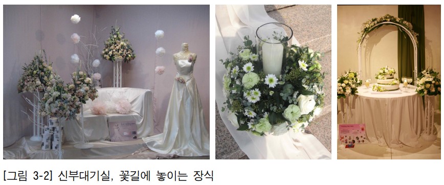 2) 결혼식장 규모, 천장높이, 내부 장식, 조명 등이 고려대상이 되며, 중앙 단상에 모든 시선이 집중되도록 하며, 꽃은 신부부케와 맞추어 분홍색, 흰색을 바탕으로 한 파스텔 색조가 적합하다.