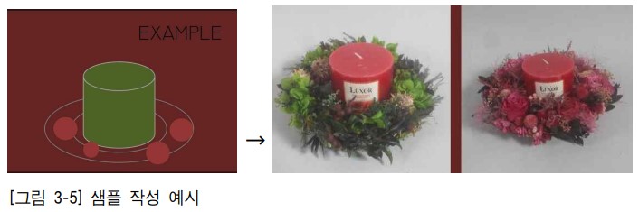 ∙ 상품 디자인 제안서에 따라 드로잉, 실물사진 촬영, 컴퓨터 등을 이용하여 상품디자인을 제시한다. 이때 사용되는 식물 종류를 표시하여 전체적인 색상과 소재가 포함된 레이아웃을 작성한다.