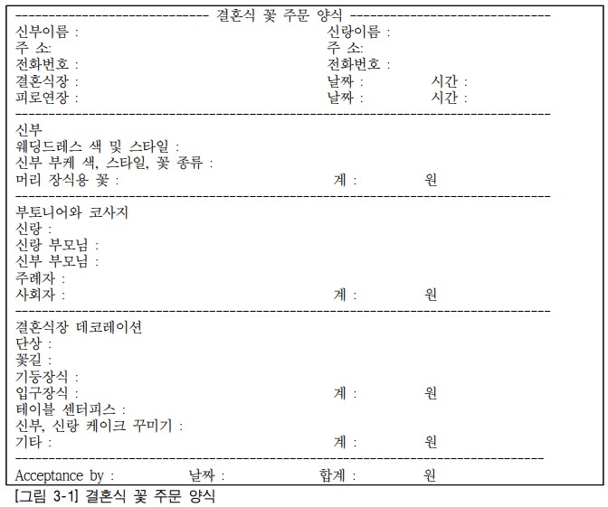 1) 결혼장식에는 단상장식, 버진로드(꽃길), 웨딩아치, 리셉션 테이블, 결혼식장 입구, 자동차장식 등으로 나누어 준비하도록 한다.