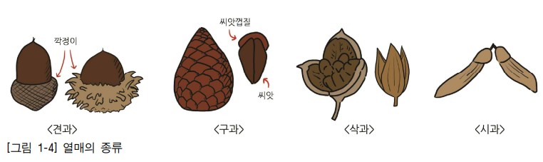 열매는 꽃의 수분, 수정 후 암술의 씨방 등이 발달한 기관으로서 종자를 가지고 있다. 나자식물과 피자식물에 따라서 열매의 형태가 다르다(이창복, 2009) (그림 1-4).