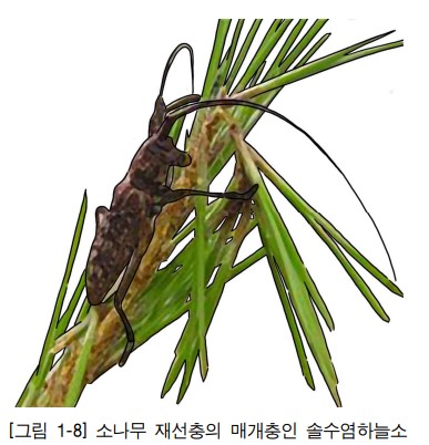 소나무, 곰솔, 잣나무에 주로 발생하며 잎이 시들고 나무 전체가 고사한다. 이에 비하여 리기다소나무, 테다소나무에는 피해가 적다. 1988년에 일본에서 유입되었고 매개충인 솔수염하늘소와 북방수염하늘소가 있다(그림 1-8).