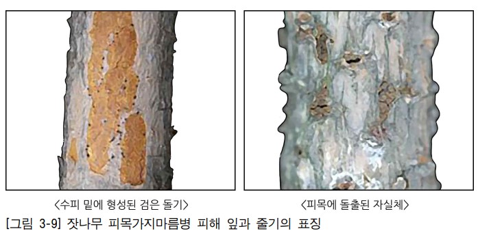 건전 부위와 감염 부위의 경계면 수피 아래에 병원체의 자실체가 검은 돌기 형태로 형성되어 있다([그림 3-9]).
