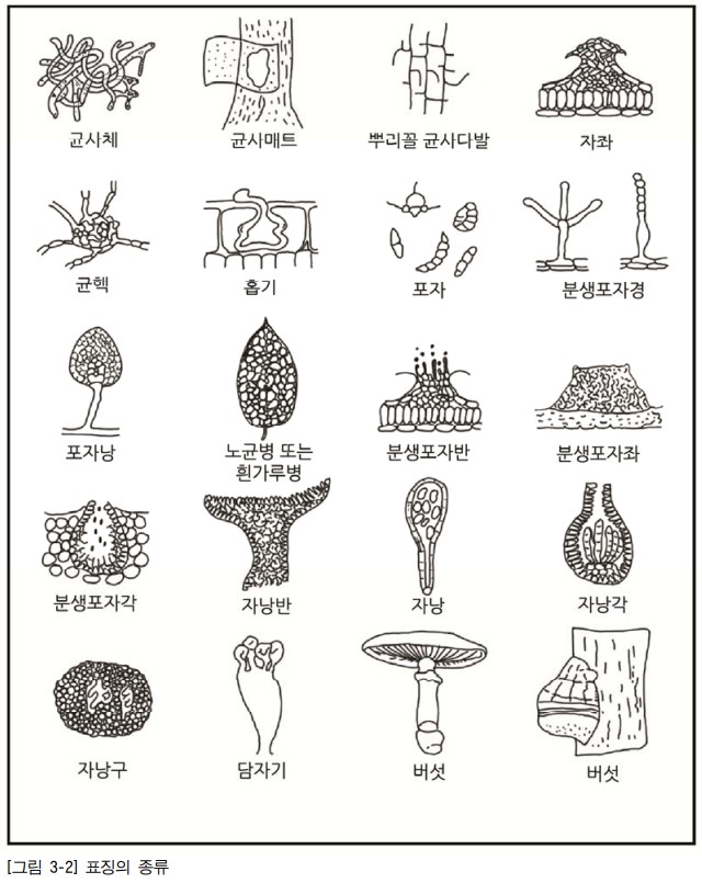 표징(標徵, sign)이란 병든 식물체 표면에 나타나는 병원체의 모습을 의미한다(그림 3-2). 곰팡이가 병원체일 경우에는 포자 또는 균사가 외부에 노출되어 육안, 확대경 또는 현미경으로 확인할 수 있다. 그러나 곰팡이보다 크기가 작은 세균, 바이러스 등이 병원체일 경우, 세균이 상처에서 집단적으로 분출되는 사례를 제외하면 육안으로 관찰할 수 없으므로 표징이라고 하지 않는다.