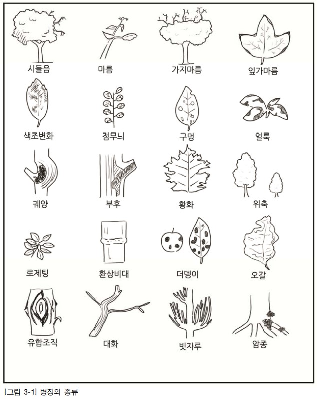 병징(病徵, symptom)이란 생물적 또는 비생물적 원인에 인하여 식물체에 나타나는 비정상적인 모습을 의미한다([그림 3-1]). 식물체 전체 또는 부분적으로 나타나며 형태, 색상, 크기 등에서 건전 식물과 차이를 보인다. 병징을 육안, 확대경 또는 현미경 등을 통하여 진단하므로 병명과 발생 원인을 추정할 수 있다.