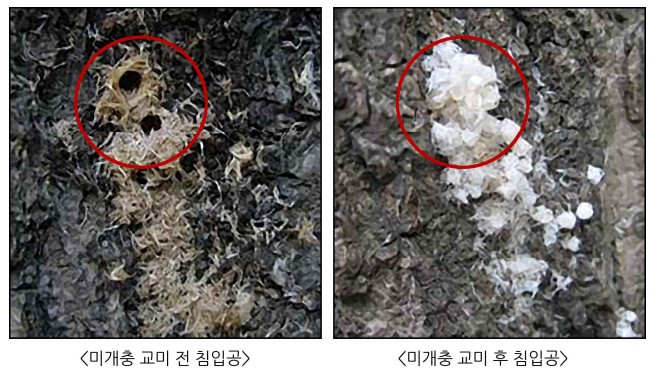 매개충이 수피를 뚫고 침입할 때 형성한 구멍(침입공)의 유무를 관찰한다(그림 3-6). 침입공은 직경이 1mm 정도이며 톱밥이 묻어 있다. 교미 전에는 톱밥이 침입공 주변에 흩어져 있으나 교미 후에는 색상이 밝고 응집된 형태로 존재한다.