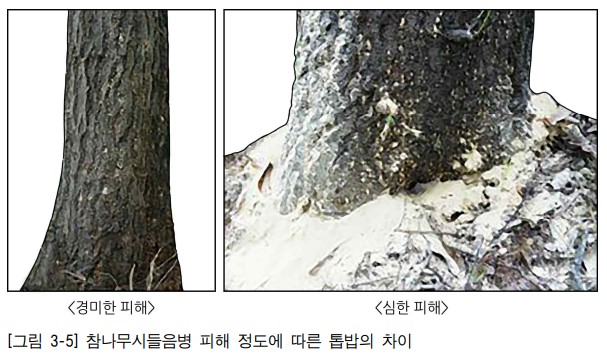 매개충인 광릉긴나무좀이 참나무류의 수피를 뚫고 침입할 때 톱밥이 분출된다([그림 3-5]). 건전목에서는 톱밥 흔적이 없으나 감염목의 수피 및 기부에는 톱밥이 존재한다. 피해가 경미할 경우에는 톱밥이 적으나 심하게 피해를 받은 나무는 많은