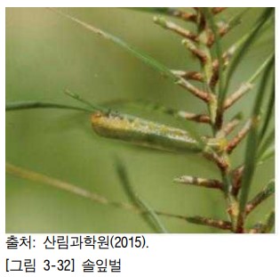 - 성충은 침엽의 중앙부근에 잎당 1개의 알을 낳으며, 산란수는 약 70개이다.