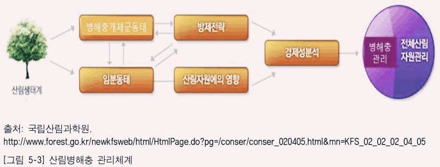 산림병해충의 방제를 위하여 해당 임분과 병해충의 동태에 관한 자료가 필요하다. 이를 기초로 방제전략을 수립하고 경제성 분석을 통하여 산림병해충을 방제한다(그림 5-3).