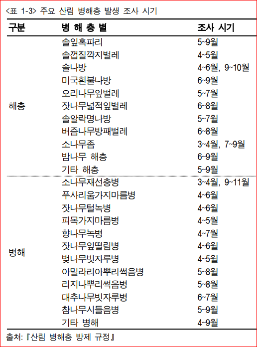 기초 자치 단체장 및 국유림관리소장은 병해충 발생 예보 발령 내용, 과거 발생 상황 및 방제 실적, 지역의 제보 사항, 언론 보도 내용 등을 참고하여 병해충별, 피해도별, 지역별로 병해충 발생 조사를 실시한다. 병충해별 발생 조사 시기를 보면 <표 1-3>과 같다.