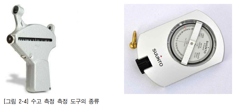 (2) 수고 조사: 작업량 산정・약제량 산정 등 재적을 산출하기 위하여 수고 조사가 필요한 경우에 수고 조사를 실시한다. 수고 조사는 조사 대상지 내에 고루 선정해야 하며, 대상목의 경급별로 각각 3본 이상을 측정하여 평균 수고를 결정하여 사용한다.