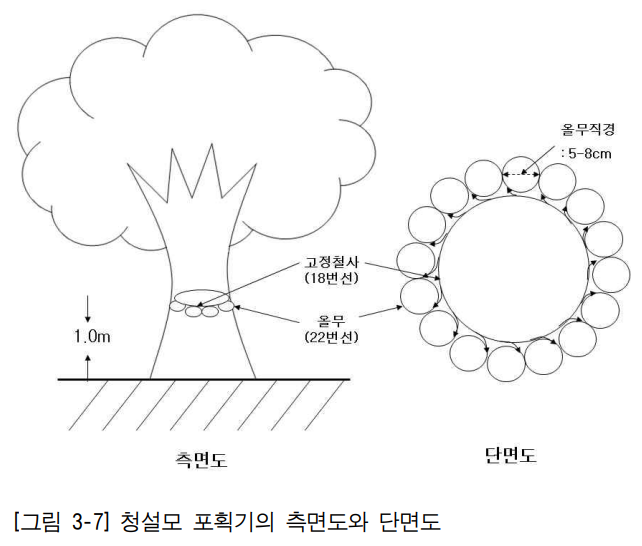 잣과 호두에 대한 청설모의 피해사례가 매우 많다. 국립산림과학원에서 개발한 청설모 포획기는 잣이나 호두의 열매를 포식하는 청설모를 효과적으로 제거할 수 있다. 그러나 수목마다 올무를 설치해야 하며, 청설모가 포획되면 매일 올무를 다시 손봐야하는 단점이 있다.