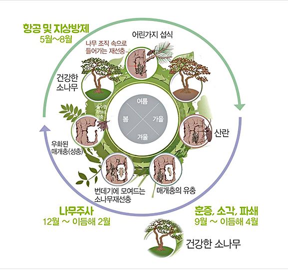 - 이런 작업은 대상 병해충의 생활사에 적합하게 이루어져야 하며 방제시기 내에 피해고사목의 벌채와 함께 산물의 파쇄, 소각, 매몰, 훈증, 목재자원 활용 등 처리가 모두 완료되어야한다. 방제시기가 아닌 때에는 피해고사목 등을 벌채하지 않는다.