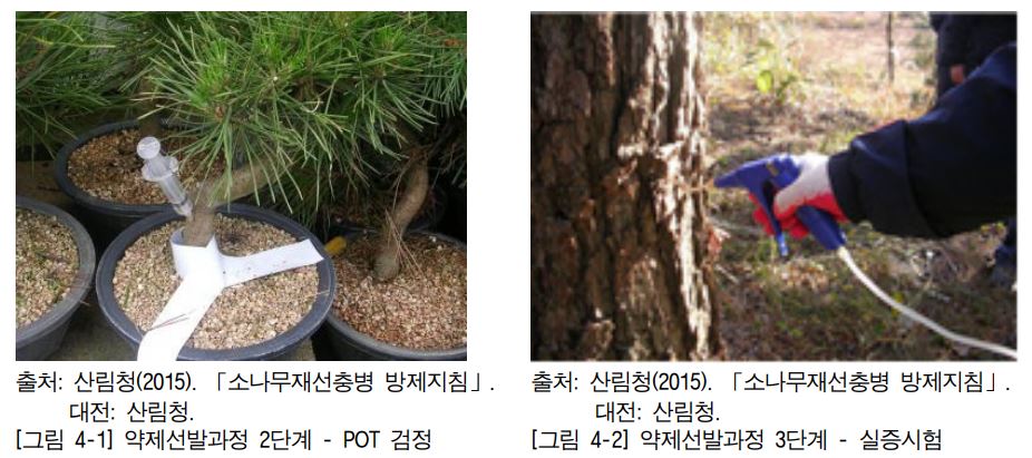 ① 방제물질탐색(실내생물검정)→ ② 1차 효과검정(폿트)→ ③ 2차 효과검정(소경목, 소면적)→ ④ 실증시험(중, 대경목, 대면적)→ ⑤ 최종 (농약등록시험, 2년)→ ⑥실용화