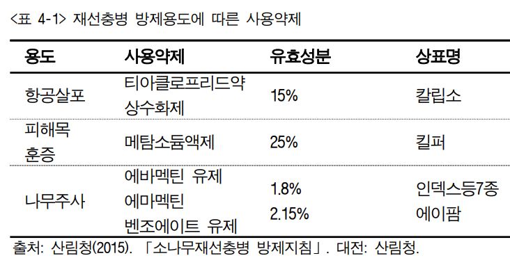 <표 4-1> 재선충병 방제용도에 따른 사용약제