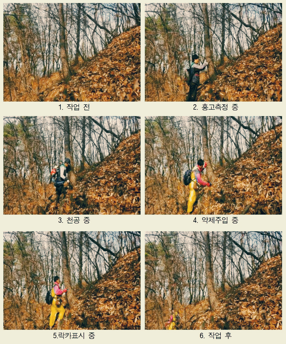 - 구멍은 가급적 소나무 하단부에 뚫는 것이 좋으며 지상 50cm 이하의 높이에 뚫는다.