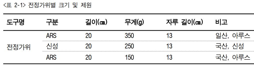 피해목의 가지를 절단하거나 정지 및 전정 작업에 사용한다. 전정 작업을 할 수 있는 가지의 굵기는 3㎝ 정도이다(<표 2-1>, [그림 2-4]).