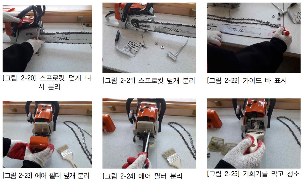 (3) 체인 톱을 눕히고, 오일 확인 “오일 이상 무!”, 혼합 연료 확인 “혼합 연료 이상 무!”, 체인 장력 확인 “체인 이상 무!”, 체인 브레이크 확인 “체인 브레이크 이상 무!”, 체인잡이 확인 “체인잡이 이상 무!”를 크게 외친다. 그 다음, 체인 브레이크를 잠그고 시동을 켠 후에 체인 톱을 들고 임목으로 가서 체인 브레이크를 풀고, 벌도목의 어깨 이하에 난 가지를 쳐 내고, 대피로와 벌도 방향에 나 있는 지피물들을 제거한다.