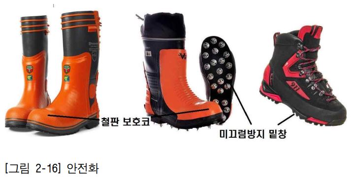 미끄러짐을 막고 습기와 추위로부터 발을 보호하여 돌부리에 부딪히거나 무거운 물체에 짓눌리는 것을 방지하고, 체인 톱에 의한 절단, 도끼 등에 의한 타격, 낫 끝과 같이 예리한 도구에 의해 발이 찔리는 것을 예방하도록 제작되어야 한다. 그 밖에 철판으로 보호된 안전화 코, 미끄럼을 막을 수 있는 바닥판 및 발이 찔리지 않도록 특수 보호된 것이면 좋다.