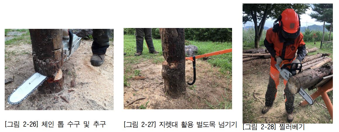 체인 톱의 벌목 작업은 다음과 같다([그림 2-26, 27, 28]).