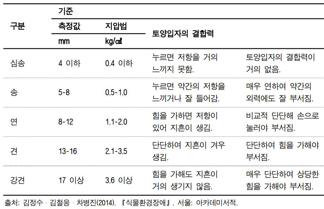 토양의 경도는 토양경도계를 이용해 측정하는데 토양경도계의 기준이 mm인 경우와 kg/cm2인 경우가 있어 측정시 어떤 기준을 활용할 것인지를 결정해야 한다.