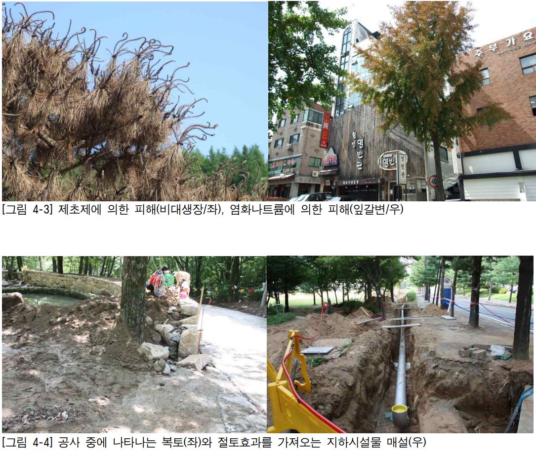 토양오염의 대표적인 경우는 제초제와 염화칼슘이다. 제초제는 비선택성을 사용하는 경우 많이 나타나는데, 호르몬 계열의 경우 잎이 비대생장 또는 과대생장이 피해증상으로 나타난다. 그 정도가 더 강해지면 수목이 고사하기도 한다. 조사하는 방법으로는 잎에 나타난 피해증상(병징)으로 확인하는 것이 일반적이다. 토양분석 등에 의한 조사는 시행해 주는 기관이 거의 없기 때문에 조사하는데 어려움이 있다. 염화칼슘에 의한 피해는 잎끝이 타들어가는 증상과 토양 pH로 확인할 수 있다. 피해가 나타나는 장소가 겨울철 내린 눈을 쌓아두기 좋은 곳인 경우가 많으며 피해는 늦봄에서 초여름에 많이 나타난다.