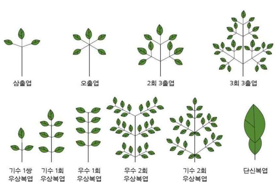 2. 복엽의 종류 : 삼출엽, 오출엽, 2회 3출엽, 3회 3출엽, 단신복엽 등을 확인한다.