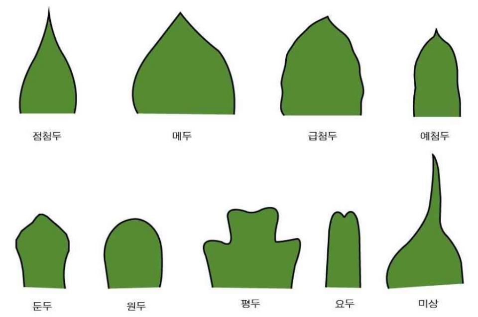 4. 잎의 끝모양 : 점첨두, 메두, 급첨두, 예첨두, 평두, 요두, 미상, 원두 등을 확인한다.