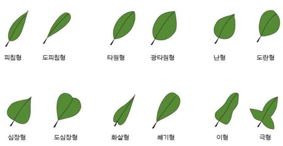 3. 잎의 모양 : 피침형, 도피침형, 타원형, 난형, 도란형, 심장형, 화살형 이형, 극형 포경, 침형, 관상형, 선형, 선형, 방패형 등을 확인한다.
