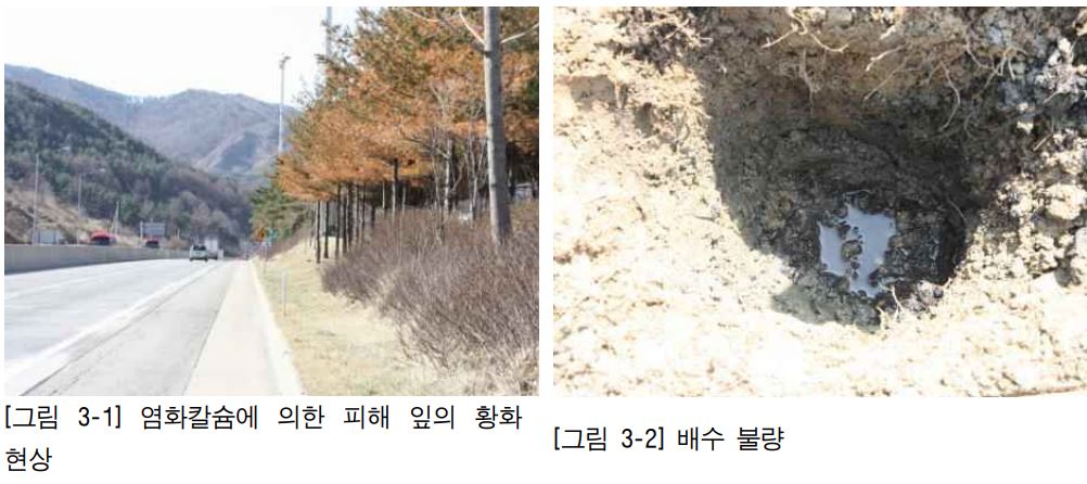 염화칼슘에 의한 피해 잎의 황화 현상 / 배수 불량