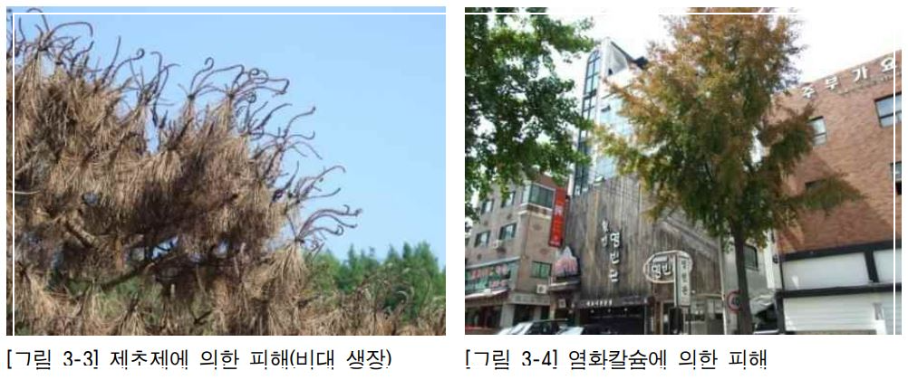 토양 오염의 대표적인 경우는 제초제와 염화칼슘이다. 제초제는 비선택성을 사용하는 경우에 많이 나타나는데, 호르몬 계열의 경우에는 잎이 비대 생장 또는 과다 공급에 의한 잎의 주름짐 등의 피해 증상으로 나타난다. 그 정도가 더 심해지면 수목이 고사하기도 한다. 조사하는 방법으로는 잎에 나타난 피해 증상(병징)으로 확인하는 것이 일반적이다. 토양 분석 등에 의한 조사는 시행 기관이 드물어 어려움이 있다. 염화칼슘에 의한 피해는 잎의 끝이 타들어가는 증상과 전기 전도도(EC)로 확인할 수 있다. 피해가 나타나는 장소가 겨울철 내린 눈을 쌓아 두기 좋은 곳인 경우가 많으며, 피해는 늦봄에서 초여름에 많이 나타난다.