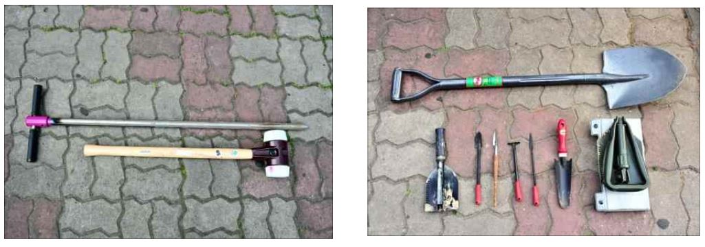 (2) 삽: 토양을 조사할 때는 다양한 삽이 필요하다. 크기가 큰 것과 작은 것, 두께가 두껍고 얇은 것 등이 필요한데, 그 이유는, 조사하고자 하는 지역에 따라 사용할 수 있는 환경이 다르기 때문이다.