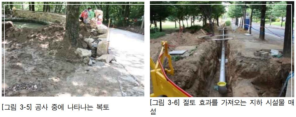 복토나 절토는 수목의 뿌리에 많은 영향을 미친다. 절토는 뿌리 생존량을 현격히 줄여 피해 증상이 나타나는데, 잎의 왜소화 및 잎 색깔의 엷어짐 등이 피해 증상으로 나타난다. 복토 역시 비슷한 증상을 보이는데, 이는 복토로 인해 상당수의 세근이 고사하기 때문이다. 복토를 하면 뿌리의 기능(지지, 흡수, 호흡)이 저하되어 우선적으로 잎에서 피해 증상이 나타난다. 조사 방법은 직접 의심이 되는 분위를 삽이나 검토창으로 파 보면 된다. 복토한 토양에서는 토층의 색깔이 다르게 나타나므로 확인하는 데 도움이 된다.
