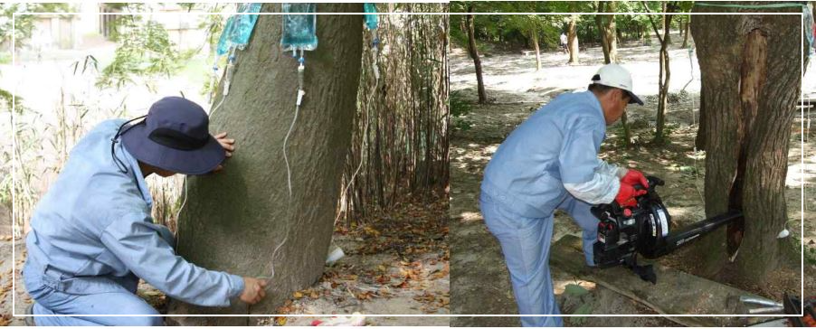 낙엽, 잎의 훼손 등이 나타나는 경우 새로운 잎이 나오도록 조치를 취해야 한다. 이를 위해서는 수간주사, 엽면시비, 토양시비 등을 선택해 복구대책을 수립한다.