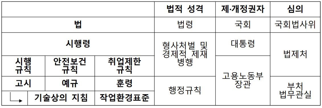 ▪ 3개의 고용노동부령 (산업안전보건법시행규칙, 산업 안전보건 기준에 관한 규칙, 유해·위험 작업 취업제한에 관한 규칙)
